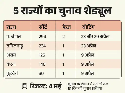 बंगाल में 23 और 29 अप्रैल को वोटिंग, 4 मई को नतीजे असम-केरल-पुडुचेरी में 9 अप्रैल को वोटिंग तथा तमिलनाडु में 23 अप्रैल को वोटिंग